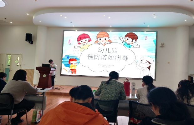 随后,保健丁老师开展诺如病毒防控专题培训。结合当前诺如病毒传播特点,丁老师详细讲解病毒传播途径、感染症状,重点说明日常预防性消毒、呕吐物规范处置、幼儿疑似症状隔离上报与护理流程,明确教职工岗位职责,强调含氯消毒剂规范使用与流动水洗手的关键作用。培训现场还开展诺如防控实操演练,两名教师现场示范消毒、处置等关键环节,流程规范、动作熟练,为全体教职工提供直观学习范本,有效提升大家科学防控与应急处置能力。