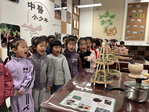 4月17日上午,孟河中心幼儿园的大班孩子们在老师的带领下,走进了孟河中心小学的校园。首先,孩子们参观了学校的各个功能区域,包括报告厅、图书馆以及充满中医文化氛围的博爱楼功能教室。在参观的过程中,孩子们不仅欣赏到了学生精心制作的中草药手工作品,还在“本草小匠坊”中近距离接触了各种中草药,激发了他们对中医文化的浓厚兴趣。