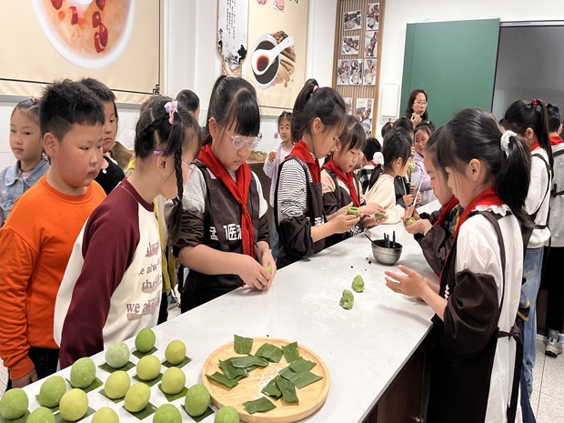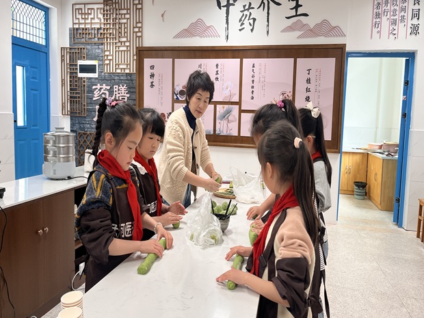 前几日,孟河中心小学的队员们就在为幼儿园小朋友们的到来开始做准备啦!队员们先将中草药实践基地中采摘的新鲜蓬蒿,经过清洗、搅打、调配……活动当天,队员们在老师指导下,兴奋地揉面、包馅、塑形,当蒸笼揭开时,翠绿油亮的青团散发着淡淡的蓬蒿清香。幼儿园的小朋友们在益元药膳屋,品尝了哥哥姐姐们亲手制作的青团、青蒿馒头,喝着由苹果、红枣、山楂等中草药熬制的健康茶饮,体会到了中医“药食同源”的深邃智慧。
