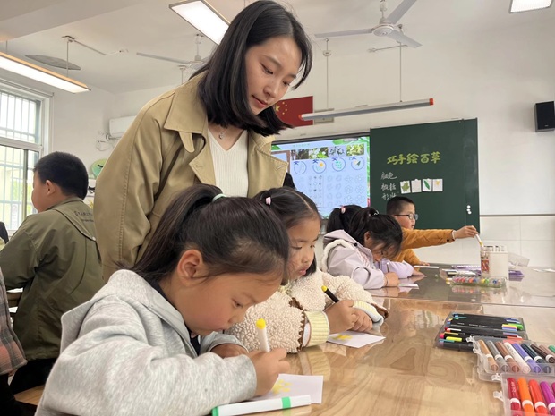 随后,孩子们观摩了小学的大课间活动,感受了小学生活的活力与节奏。在分散活动环节,孩子们在诚乐广场学做了养生操,一招一式间透露出对健康生活的向往;在博学楼美术教室,他们巧手绘制百草图,用画笔记录下对中草药的独特理解。