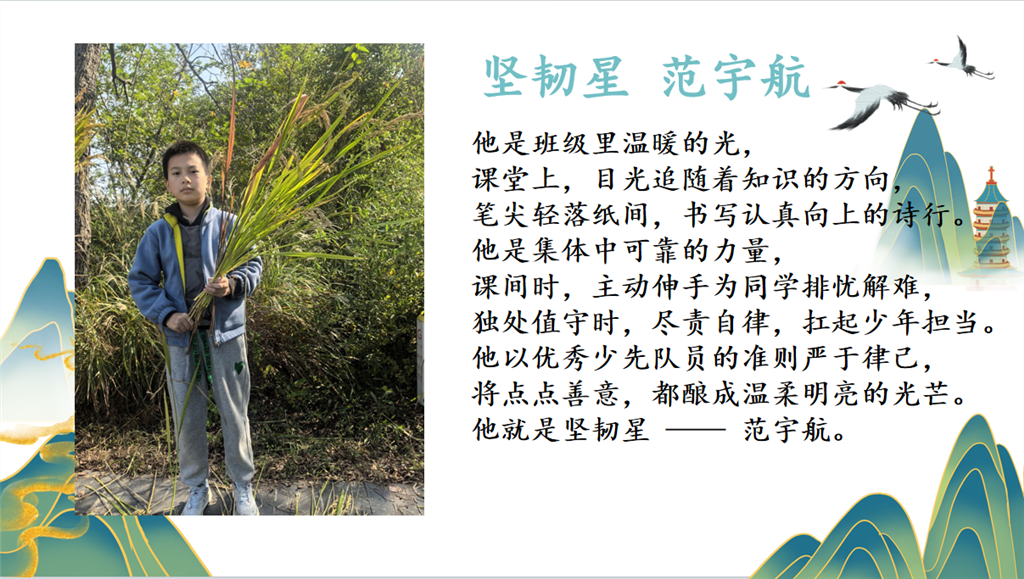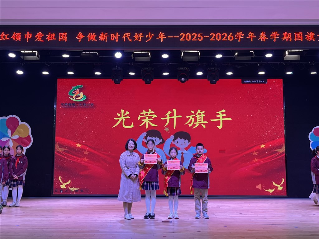 五 8 海豚中队,是一个同心聚力、朝气蓬勃的温暖集体。队员们如灵动的海豚守望相助,似春日新芽拔节生长。从稻田丰收体验到水质探究,从植物拓染到自然守护,他们在知行合一中积蓄力量,在实践历练中绽放光芒,用热爱与坚持书写成长篇章。此次仪式,陈沁逸、刘芷因、范宇航三位队员光荣担任升旗手,分别获评智慧星、文雅星、坚韧星,以品学兼优的表现成为全校榜样。张校长亲自为升旗手授光荣带、颁发证书,勉励队员们从小立志、勤学善思,争做新时代好队员。