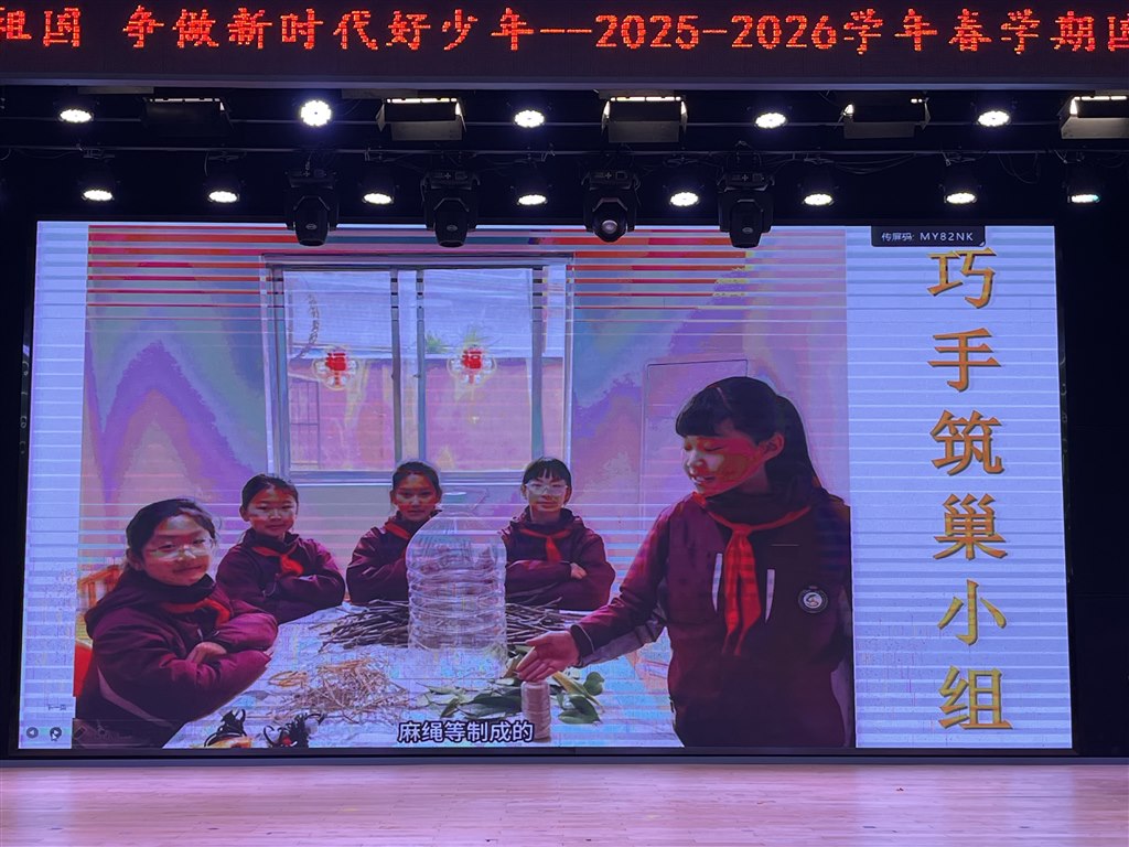 巧手筑巢小组:为守护校园鸟类,队员们巧用废旧材料制作爱心鸟窝,以双手为小鸟搭建温暖家园。在分工协作、动手创造中,他们懂得尊重生命、关爱自然,让环保理念落地生根。