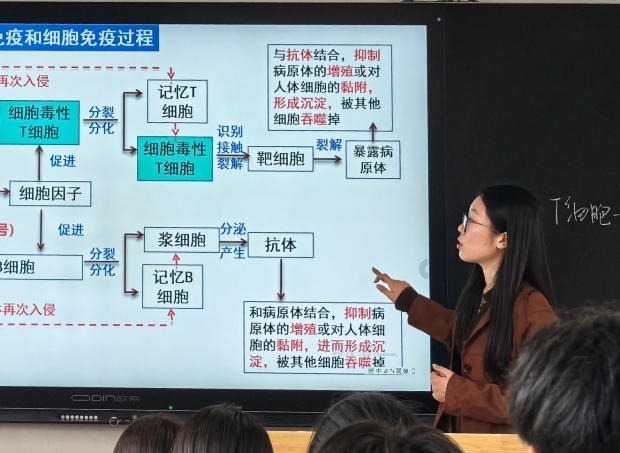 西夏墅高中陈书娴老师以 2025 年诺奖成果为情境主线,将前沿科研与高考考点深度融合,设计新颖、逻辑清晰。课堂从调节性 T 细胞的发现入手,层层递进回顾体液免疫与细胞免疫,通过典题精讲、机制图解、例题变式精准突破 Treg 作用机理、免疫应用等重难点。教学中注重知识建模与思维训练,引导学生构建免疫调控网络,实现从知识理解到解题应用的提升。整节课节奏紧凑、重难点突出,既贴合高三复习需求,又拓宽学生科研视野,充分展现了扎实的教学功底与创新的教学理念。