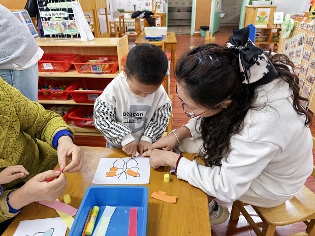 在首次活动中,伴随着轻快的音乐,宝贝们在家长的陪伴下陆续到来。在老师的引导下,宝贝们从最初的羞涩,到勇敢地挥手说“你好”,完成了进入集体环境的第一步。音乐律动《你好呀》迅速拉近了彼此的距离,宝贝们跟着旋律挥手、点头,在欢乐的节奏中感受集体氛围。随后的“颜色对对碰”游戏,让宝贝们在寻找红色、黄色“好朋友”的过程中,锻炼了观察与配对能力,也体验了和同伴互动的乐趣。美术活动《美丽的蝴蝶》则是宝贝们展示巧手的舞台,他们用撕、贴的方式为蝴蝶翅膀穿上“花衣”,在锻炼手部精细动作的同时,也收获了创作的喜悦。活动在“彩虹伞大冒险”中达到高潮,五彩斑斓的彩虹伞下,宝贝们和家长一起抖动、运球、钻山洞,在欢声笑语中体验了集体协作的快乐,也锻炼了肢体协调性。