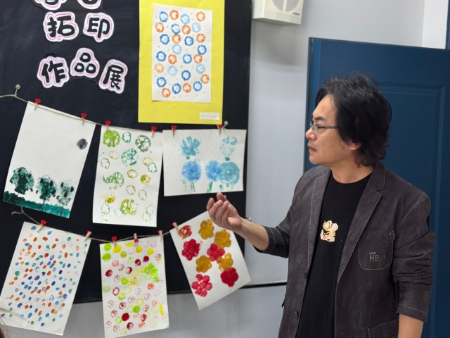 课堂上,黄雯君老师以“春日寻美”为主线,将拓印技法与春日元素巧妙融合,构建了充满童趣的教学情境。课前,一段展现春日美景的视频将学生带入春天的意境,自然引出“把春天印在画里”的单元任务。黄老师通过“生活印痕大发现”“肌理猜猜看”“拓印魔法小游戏”等系列活动,引导学生从身边的材料中寻找肌理、辨别材质,在互动游戏中理解拓印的基本原理。随后的“印痕大变身”示范环节,黄老师现场展示了瓦楞纸、吸管、报纸等材料的创意改造方法,通过“卷一卷、剪一剪、揉一揉”,让学生直观感受不同材质拓印出的独特效果,为后续创作打开了思路。