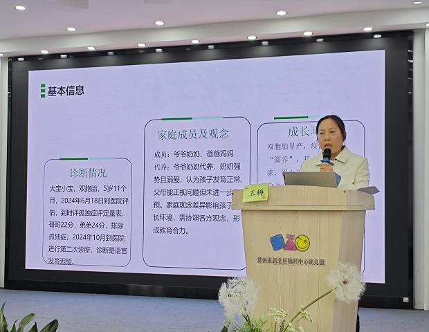 活动伊始,龙虎塘街道中心幼儿园王梅老师带来专题讲座《遇见爱,遇见成长——语言发展迟缓儿童的成长故事》。她结合一线真实教育案例,细致分享语言发育迟缓幼儿的个性化教育支持策略,内容贴合实操、干货满满,为在场教师开展融合教育工作提供了切实可行的实践思路与参考方法。