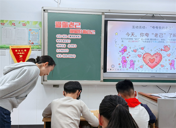 随后,段老师带领学生认识情绪、正视压力,强调爱自己并非任性放纵,而是理性地照顾身心。班会重点介绍了“爱老己”四项实用方法:练习友善的自我对话、开展“夸夸我的老己”互动、构建个人能量充电站、学会对不合理要求说“不”。在“夸夸我的老己”环节,学生们用心写下自身的优点与进步,并用贴纸记录成长点滴;在制作“爱己行动卡”时,大家认真规划一周内关爱自己的小行动,用文字与图画表达对自我的温柔关怀。
