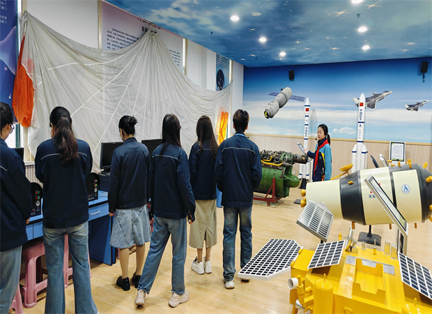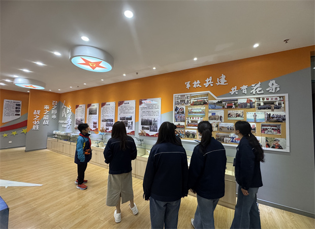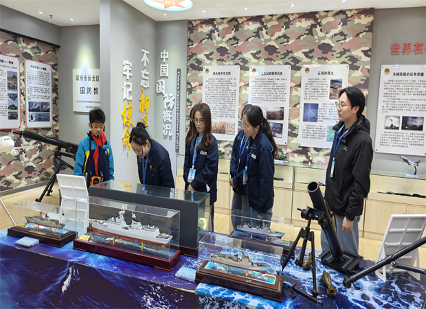 在讲解员的引导下,参观人员首先走进学校国防展厅与航空展厅。展厅内,实物陈列、图文展板、场景复原等形式系统展示了国防建设历程、航空科技成就及国家安全知识。从五大军种介绍到辽宁舰、C919等重大装备模型,从勃朗宁重机枪到“常州舰”护卫舰,大家在一件件展品前驻足学习,直观感受国防力量的坚实支撑。