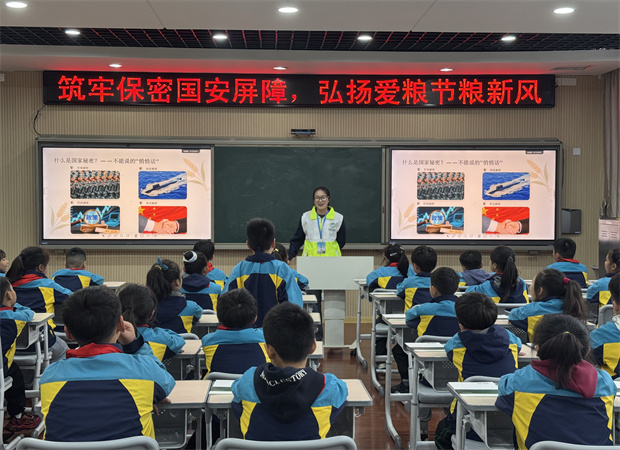 参观结束后,中央储备粮常州直属库的工作人员为学校三(4)班学生带来了一场题为《筑牢保密国安屏障,弘扬爱粮节粮新风》的专题讲座。讲座紧扣总体国家安全观,系统讲解了国家秘密的基本范畴、保密行为规范以及12339举报渠道,明确提出“不该说的不说、不该拍的不拍、不该传的不传”三大准则。